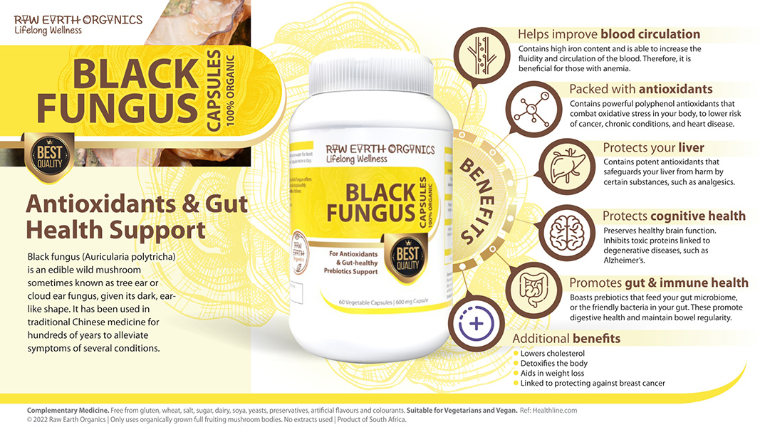 Black Fungus (Auricularia polytricha) is an edible wild mushroom sometimes known as tree ear or cloud ear fungus, given its dark, ear-like shape.